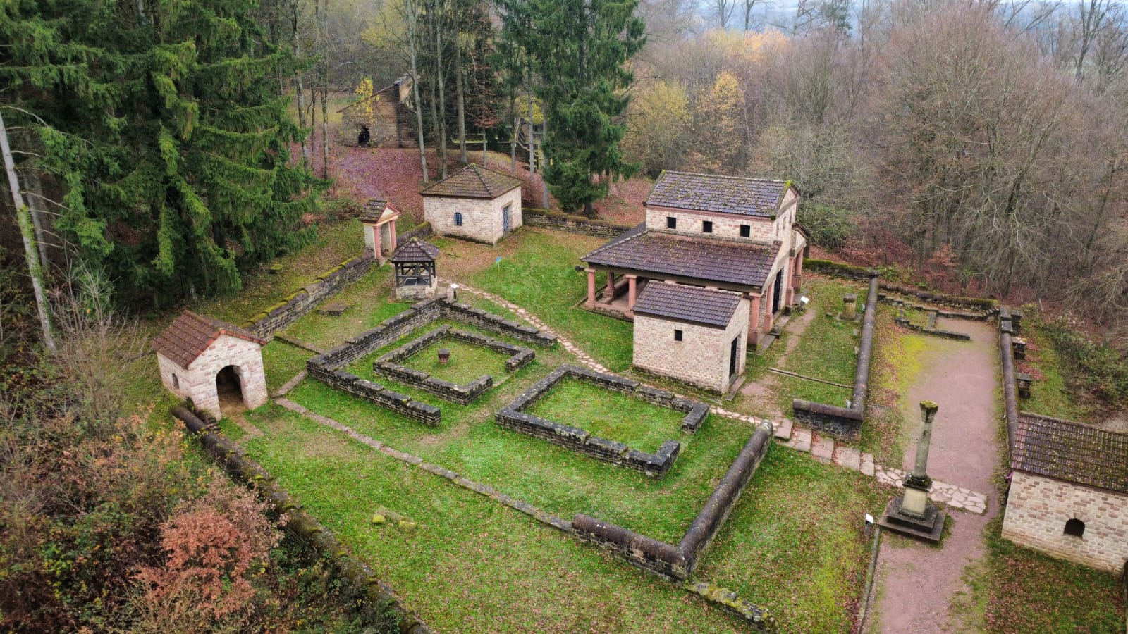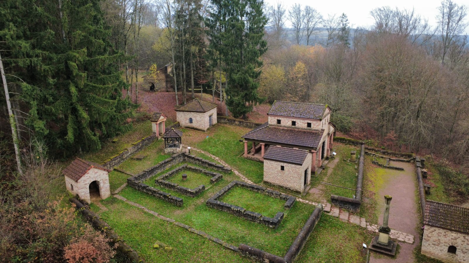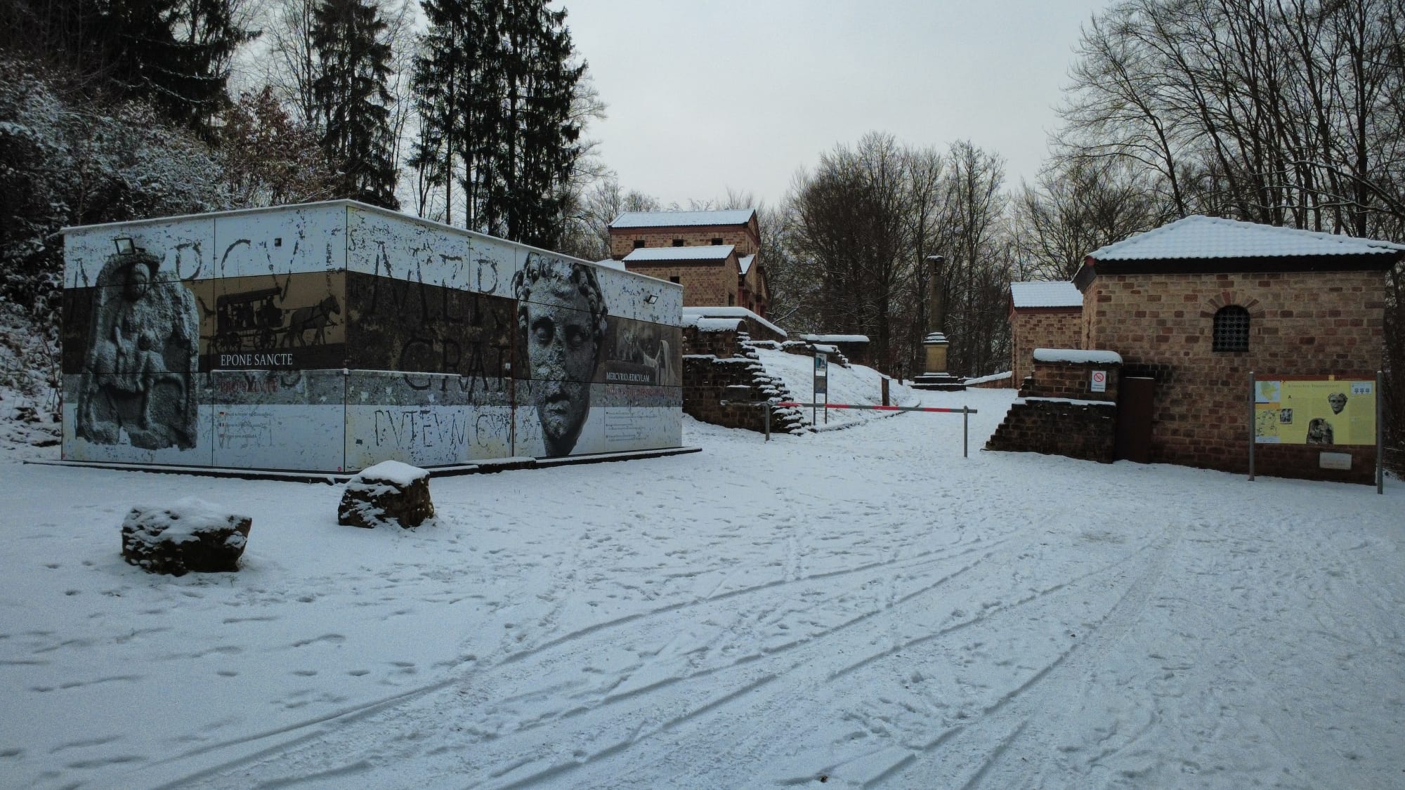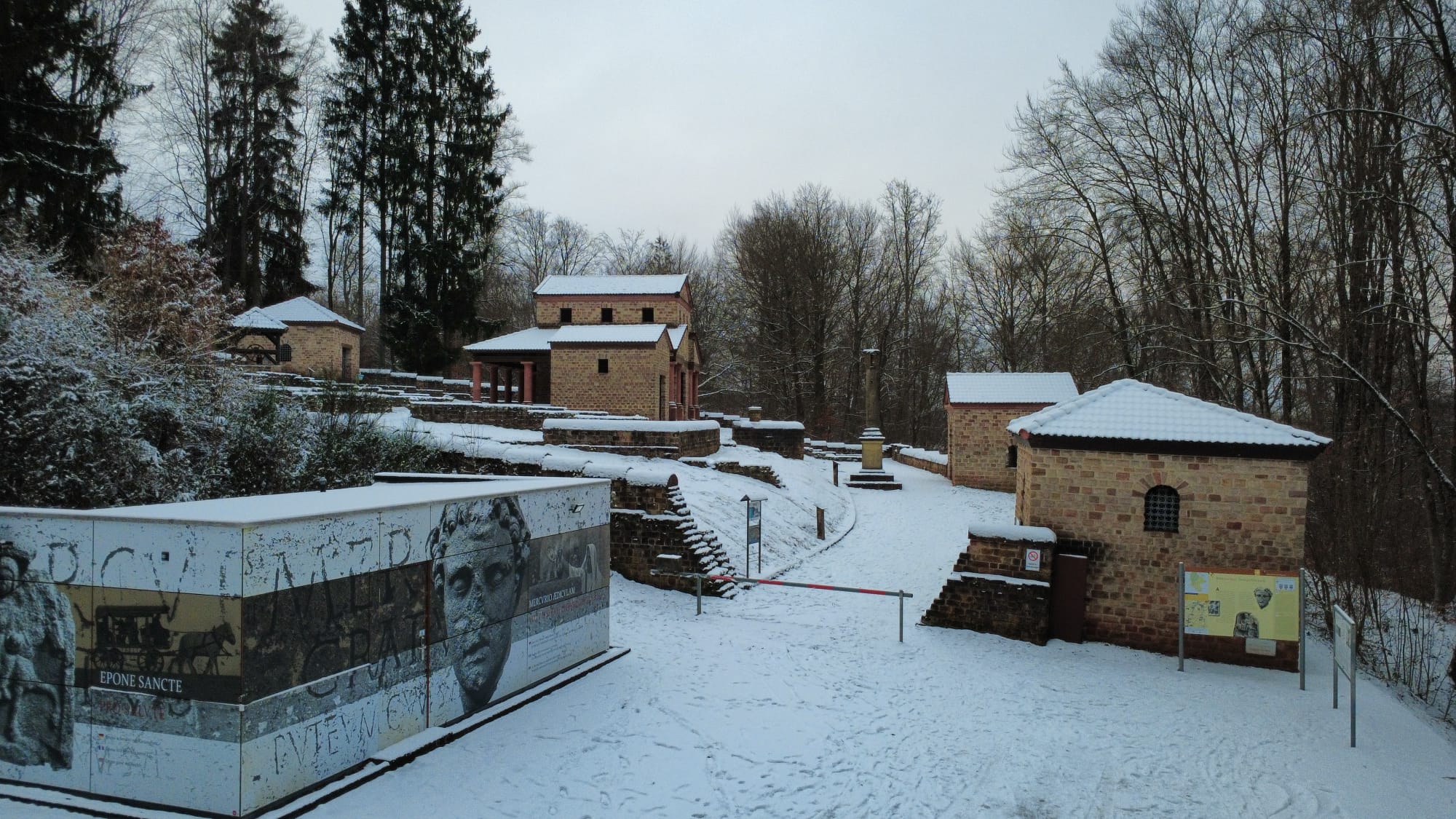 Der Römische Tempelbezirk befindet sich auf dem Metzeberg oberhalb von Tawern. Die Luftaufnahmen zeigen die Anlage in ihrer gesamten Ausdehnung und verdeutlichen die klare Gliederung der römischen Bauwerke. Mauern, Tempelreste und Wege lassen sich aus der Vogelperspektive besonders gut erkennen – sowohl bei schneefreier Landschaft als auch im Winter, wenn der Schnee die Grundrisse deutlich hervorhebt.